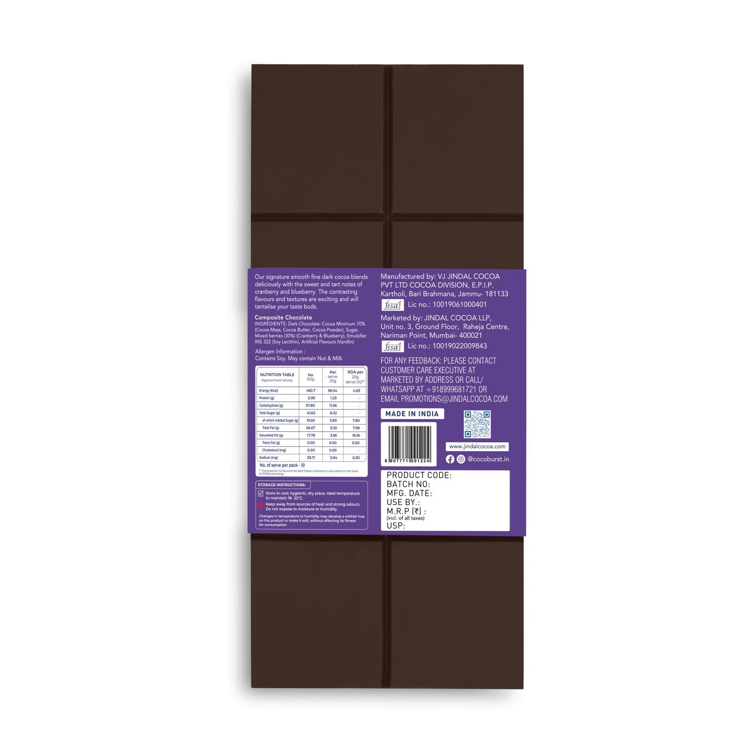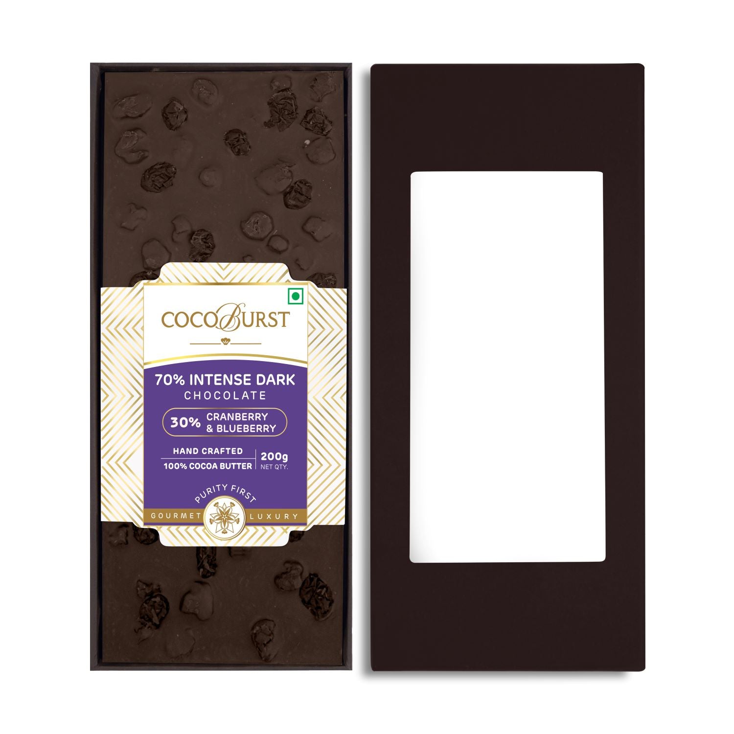 - Embark on a flavorful journey with CocoBurst 70% Intense Dark Chocolate, where the bold richness of premium cocoa meets the tangy sweetness of 30% cranberries and blueberries. Crafted with 100% pure cocoa butter, this handcrafted treat is a symphony of contrasting textures and flavors, designed to tantalize your taste buds.