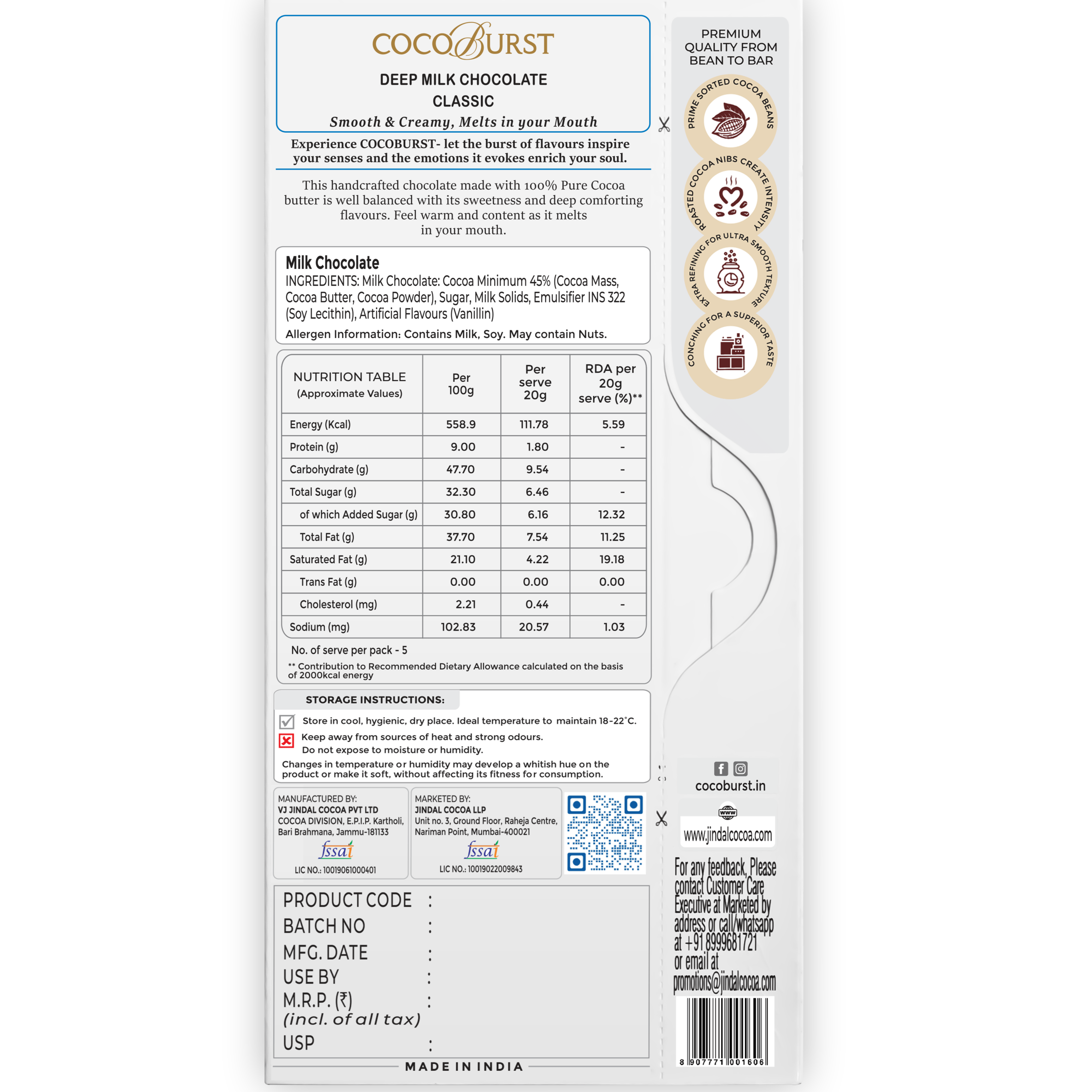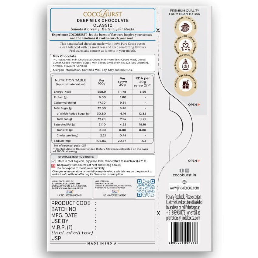 Indulge in the timeless elegance of CocoBurst Deep Milk Chocolate Classic, where the rich creaminess of handcrafted milk chocolate is perfectly balanced with its sweetness and deep cocoa flavor. Made with 100% pure cocoa butter, this chocolate delivers a luxurious melt-in-your-mouth experience that leaves you feeling content and satisfied.