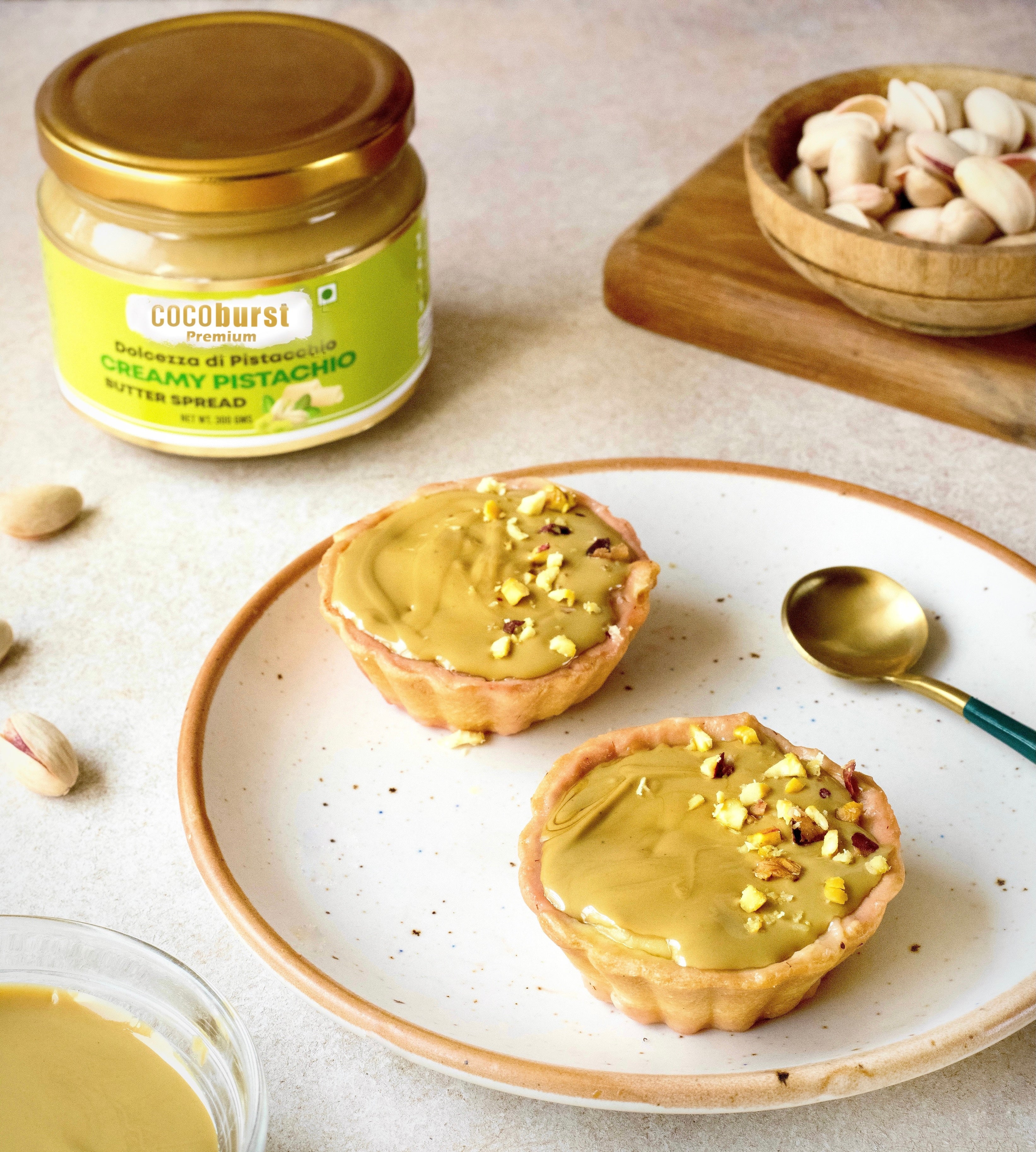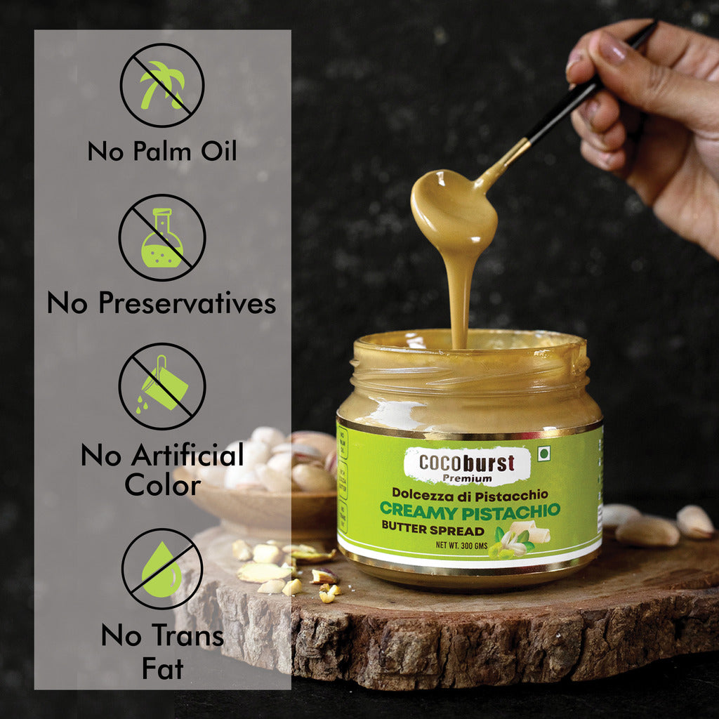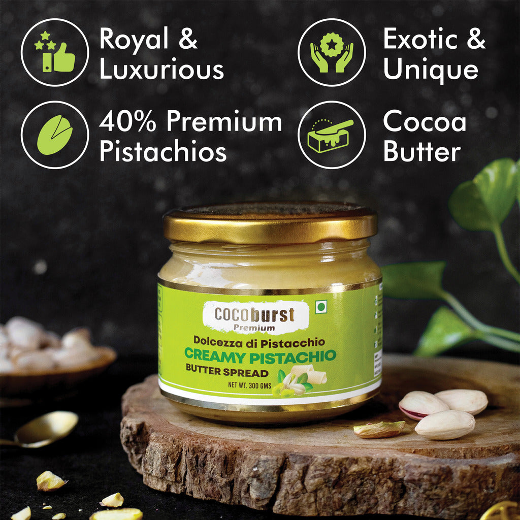 Crafted with 40% roasted premium pistachios and rich cocoa butter, Cocoburst Premium Creamy Pistachio Butter Spread delivers a perfect balance of nutty richness and silky smoothness, making it an irresistible treat for both everyday use and gourmet creations.