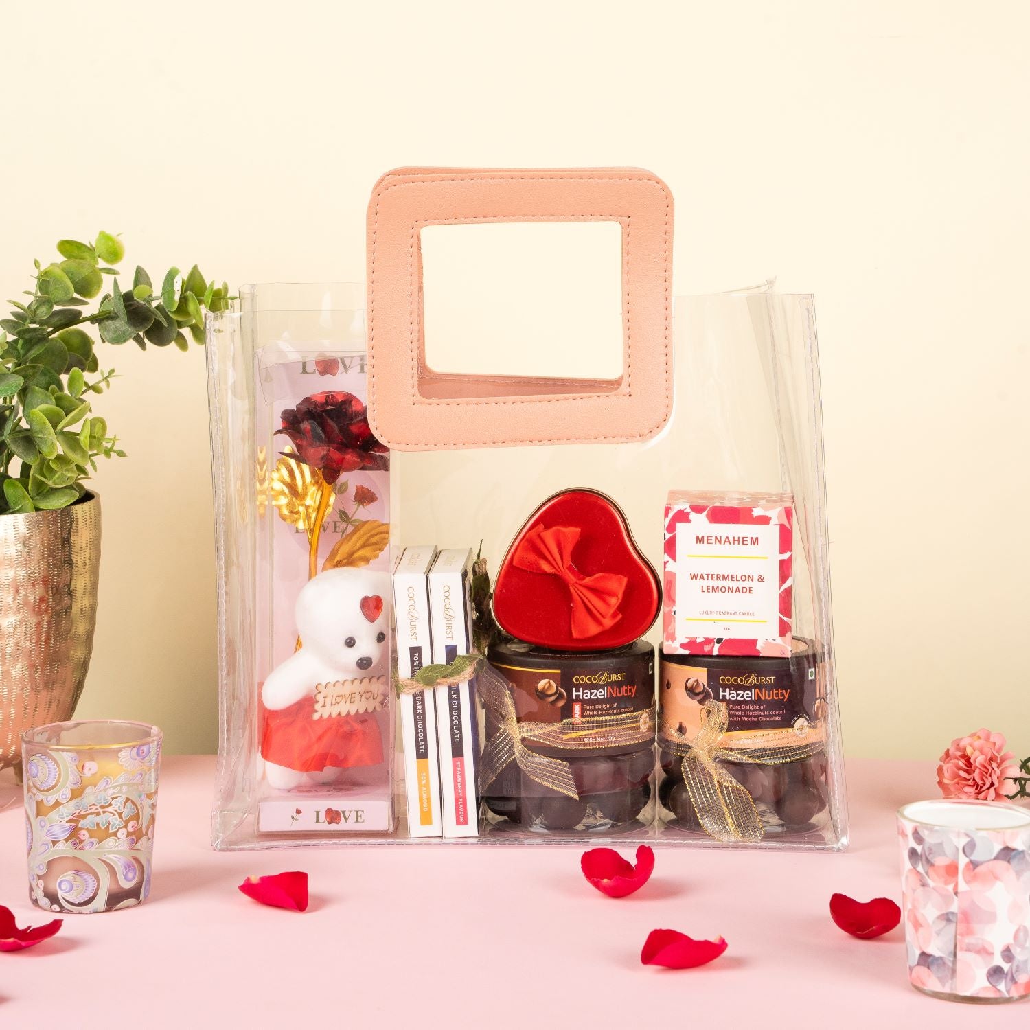 - Premium Transparent Bag: Elegant and reusable with leather-style handles for a stylish presentation.